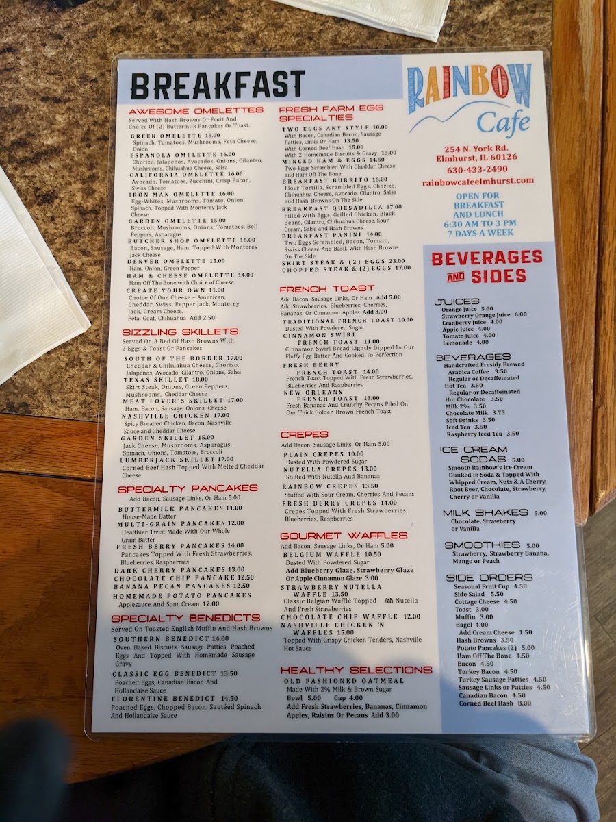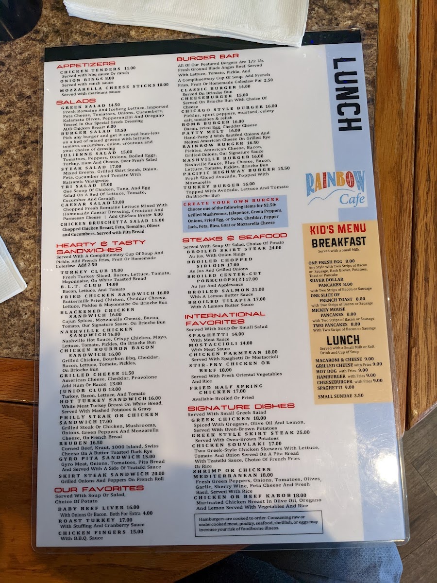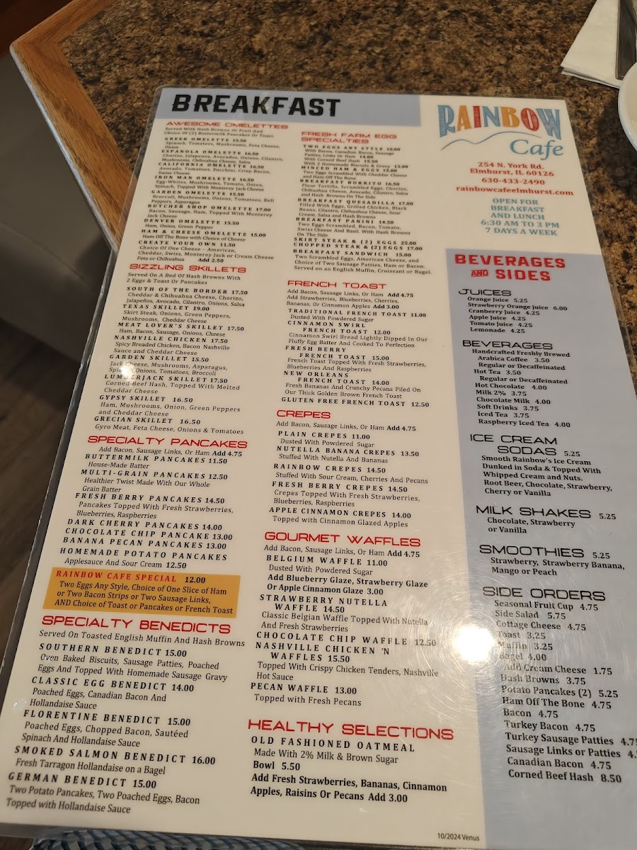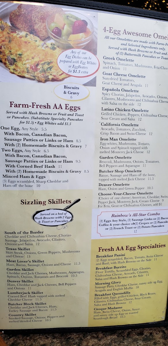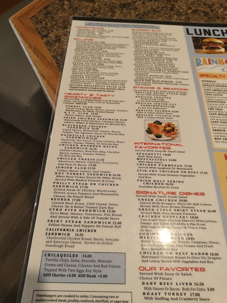The menu at Rainbow Cafe offers a comforting blend of classic American and family-style dishes, perfect for breakfast, brunch, or a relaxed lunch. It’s a straightforward selection of hearty favorites and familiar flavors, from fluffy omelettes like the Denver and Greek varieties to skillets loaded with fresh vegetables and savory meats. Casual bites such as mozzarella sticks and chicken and waffles invite sharing and simple enjoyment.